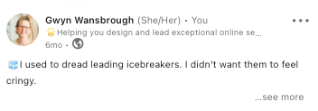 Here's a popular LinkedIn post I wrote a few months ago with 10 pro tips for leading cringe-free icebreakers that I've learned over the years. Things like starting easy, gradually increasing risk, finding the stretch zone, and more.