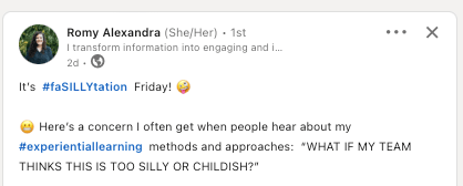 Romy Alexandra is one of my go-to sources for experiential learning and psychological safety. She shares amazing facilitation insights each week on LinkedIn.