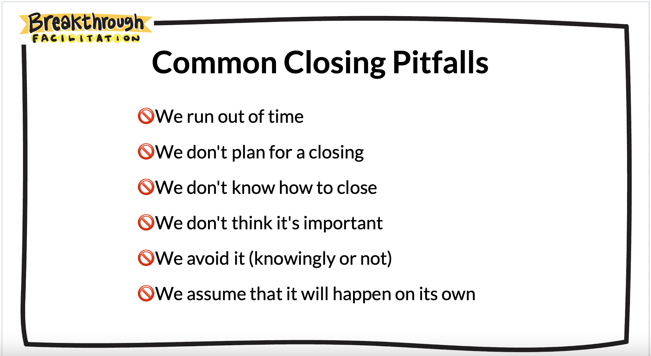 The thing is, closings matter - a lot. They tie up loose ends. They help participants digest new knowledge. And then transform that knowledge into actionable steps. How you end is often what people remember the most.