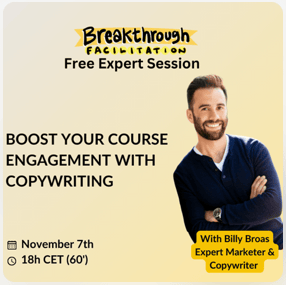 Don't miss this workshop - it's a total breakthrough. Billy's copywriting techniques boosted engagement in my own course. And trust me, this is an untapped facilitation skill that very few people are talking about.