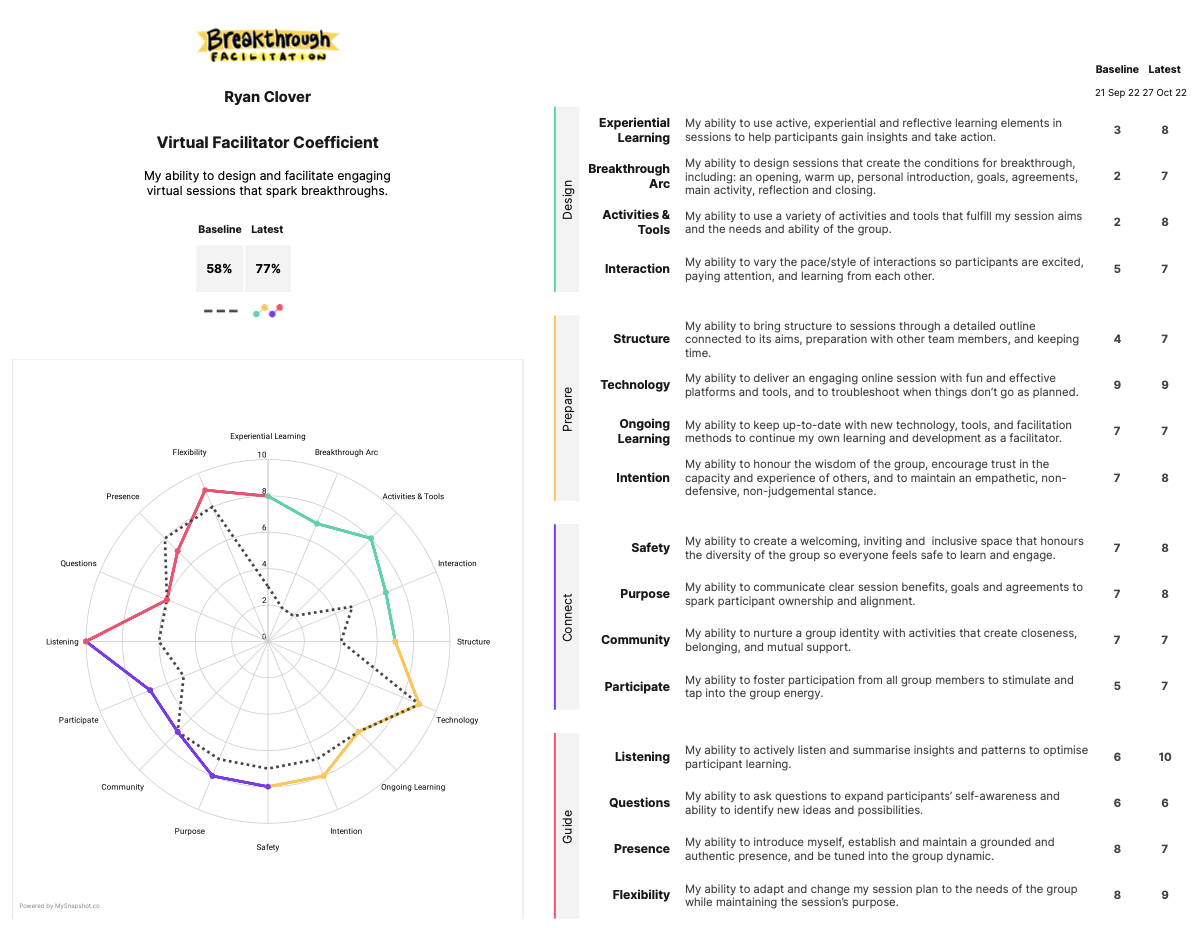 Before the closing session, I asked the group to fill in a self-assessment survey. It's called the Virtual Facilitator Coefficient. It's a tool I developed with the brilliant MySnapshot founder Charlotte Crowther that helps students track their progress through the course.